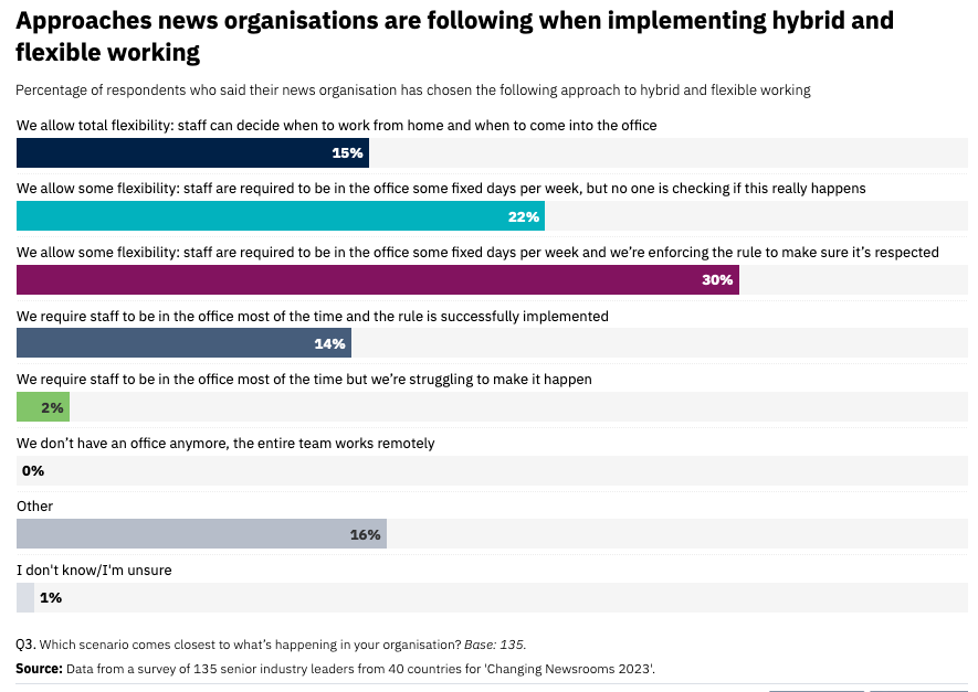 Conversely, nearly two thirds of newsrooms have moved towards flexible and remote working since covid-19, building in specific policies and processes.