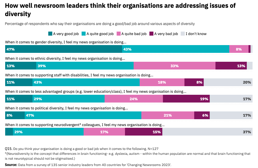 There is room for improvement though, as news leaders admit they could be doing a better job in supporting various diverse groups: gender (9 per cent), ethnicity (46 per cent), disabilities (26 per cent), disadvantaged groups (43 per cent), political (27 per cent), and - new to the study - neurodiversity (33 per cent).