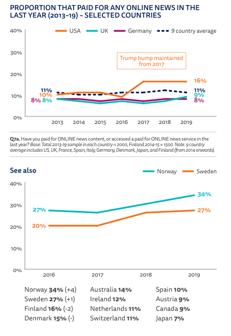 The UK sits at 9 per cent of paying news audiences, representing just 1 per cent growth since 2013, while the US remains strong from 2016 Trump Bump. It saw paying audiences jump from 9 per cent to 16 per cent in 2017, and it has remained at that figure since.