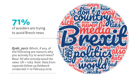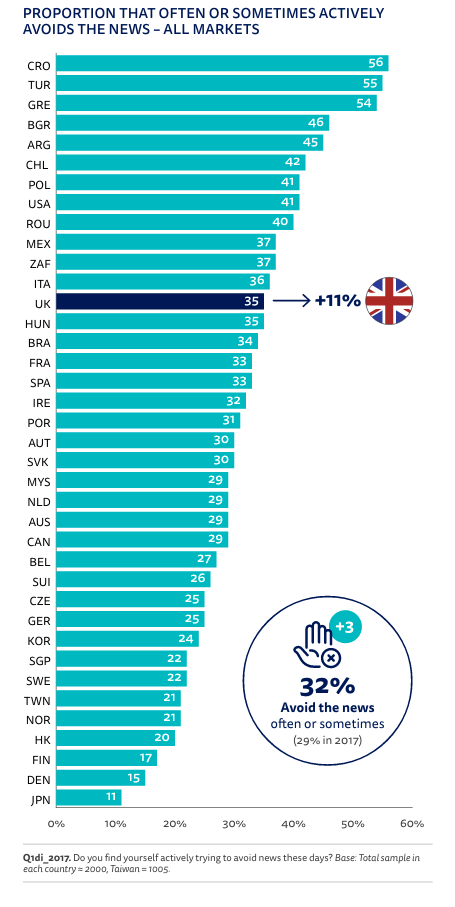 News avoidance is a real problem, with 32 per cent of overall audiences switching off - a figure up 3 per cent from last year. Why? In the UK - where news avoidance is 35 per cent - the answer is obvious. Brexit is to blame for two thirds of news avoidance, with 58 per cent of audiences saying the news as a whole is too depressing, and 40 per cent feeling unable to have an impact.