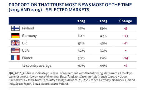 The result of news avoidance is an overall 2 per cent dip in trust in the news. The UK fell from 51 per cent in 2015, to 40 per cent in 2019.