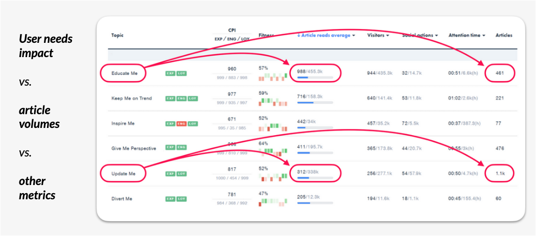 There are eight user needs total, and newsrooms usually overproduce one of these - "update me" articles - underserving audiences craving the other seven. User needs that overscore in engagement metrics, despite lower article counts, are considered underserved.