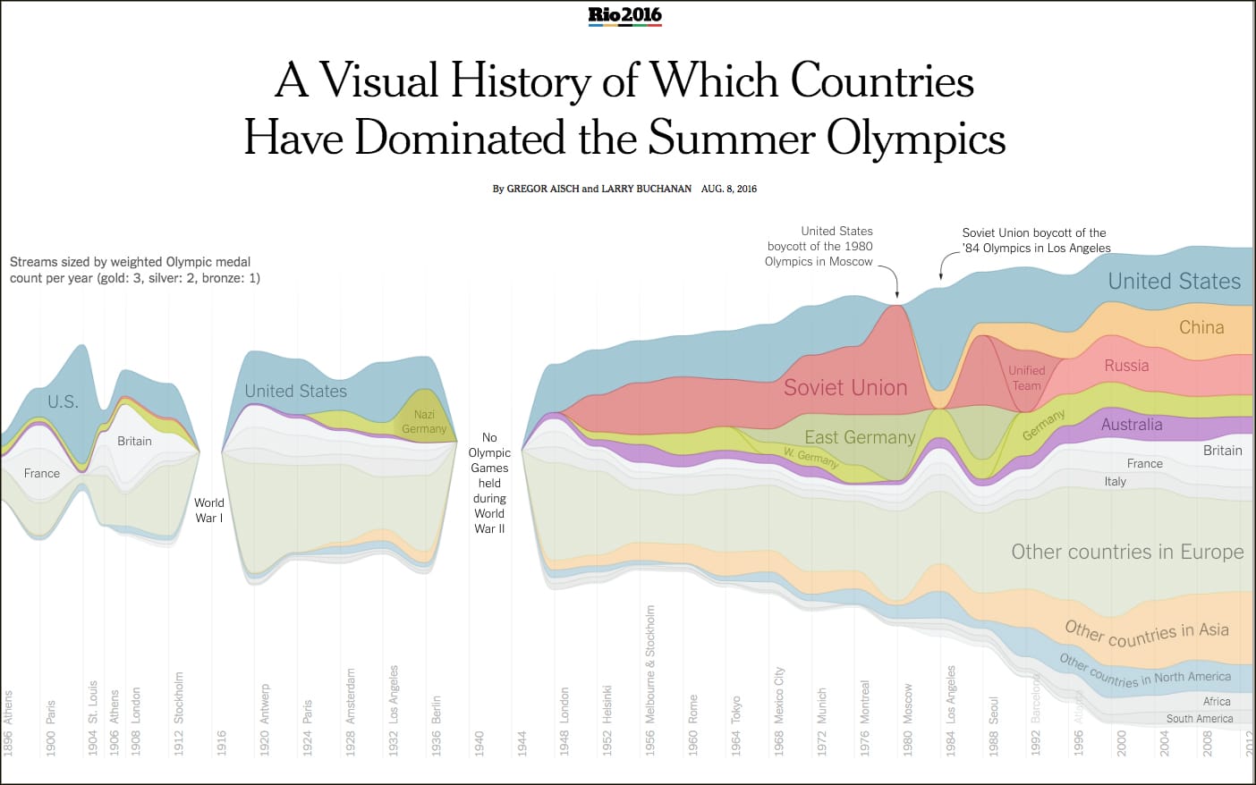 NYT's Gregor Aisch and Larry Buchanan visualised the number of medals each country has won in each Olympic year, starting from the games in Athens in 1896, when the medals were split between just 10 countries.