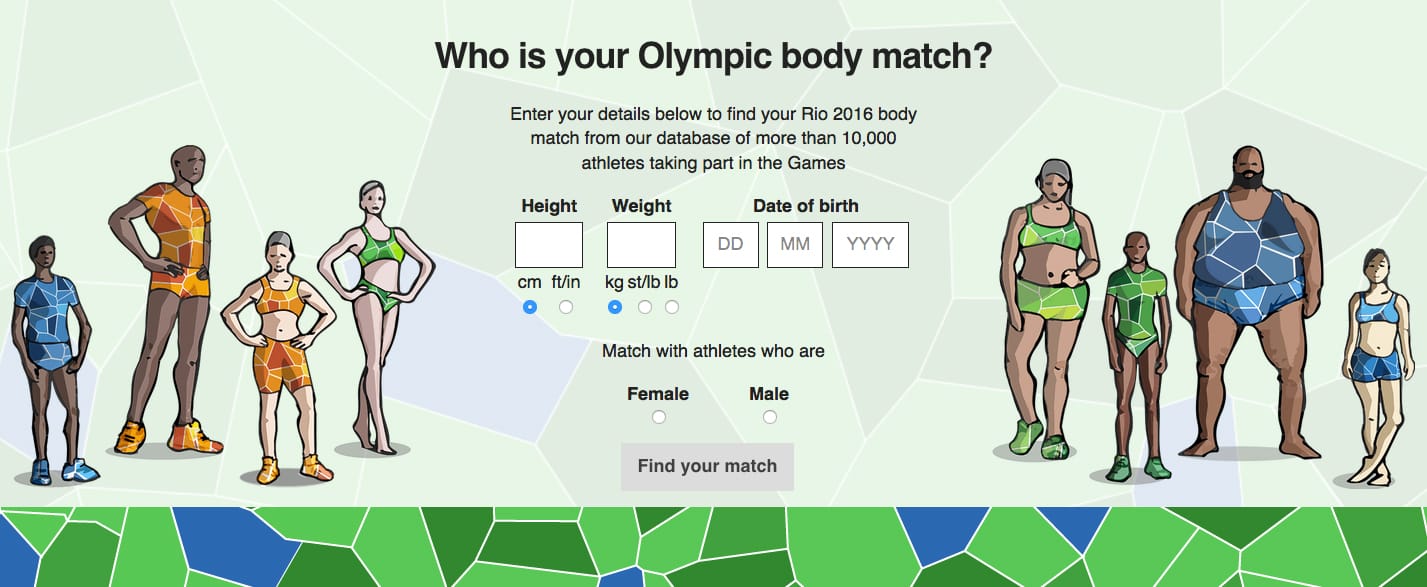 The interactive asks for your height, weight, date of birth and gender, and provides your top three matching athletes, as well as insights on where you rank compared to the height, weight and age of Olympic athletes.