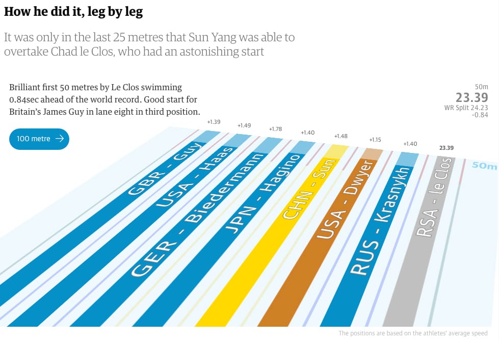 The Guardian's Apple Chan Fardel and Carlo Zapponi visualised athletes' times in the 200m freestyle race, showing how China's Sun Yang, who was behind South Africa's Les Clos for three quarters of the race, eventually won the gold medal.