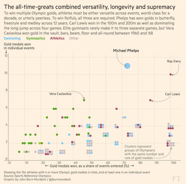 FT's John Burn-Murdoch took on the task of determining whether Michael Phelps is the most successful athlete at the Olympic Games in modern history, and how someone would even measure this. Should medals won as part of a team count the same as medals won at individual events for example?