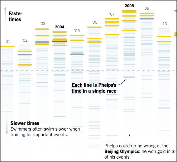 NYT's Derek Watkins and Larry Buchanan analysed Phelps's individual race times, starting from the Olympic Games in Sydney until the races in Rio.