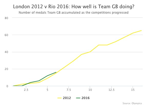 Ashley Kirk of The Telegraph addressed concerns that Team GB is not winning as many medals as expected in Rio by comparing the current medal count with the London 2012 count at this stage in the Games.