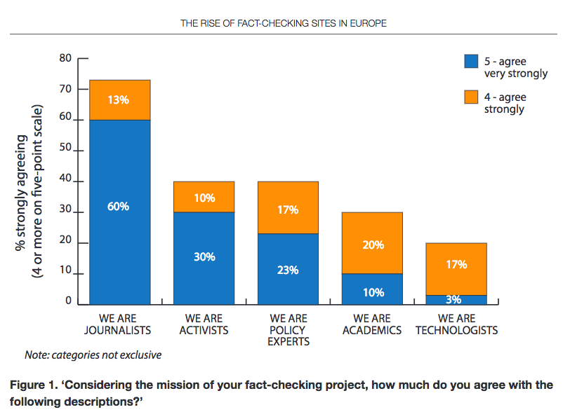 Three quarters of fact-checkers who responded to the survey consider themselves journalists, and 40 per cent say they are activists