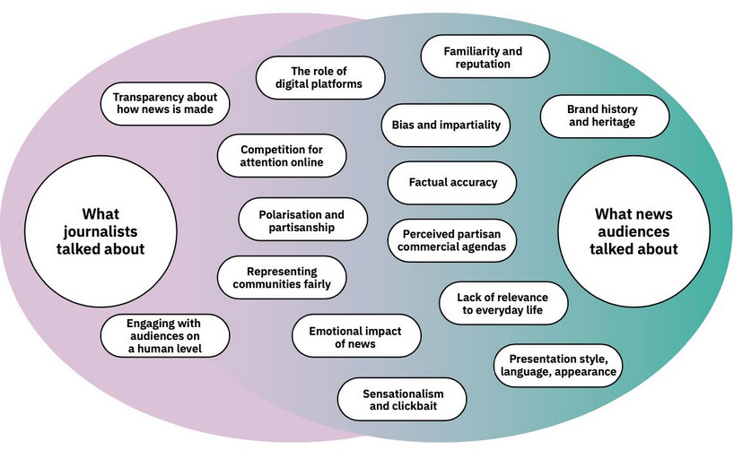 The below infographic shows popular themes of discussion around trust between journalists on the left, and audiences on the right. Subjects in the middle are overlapping discussions; subjects at either end are isolated to that group.