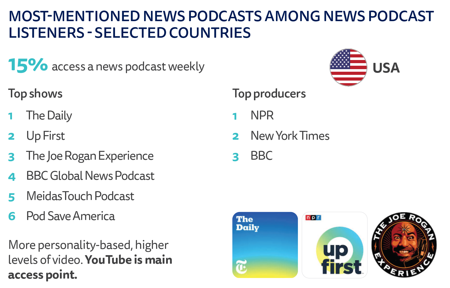 The Joe Rogan Experience, MeidasTouch, and Pod Save America all rank among the most frequently mentioned news podcasts in the US, often blurring the lines between journalism and commentary. Many of these are filmed and consumed on YouTube, which now surpasses Spotify as the dominant podcasting platform across all age groups.