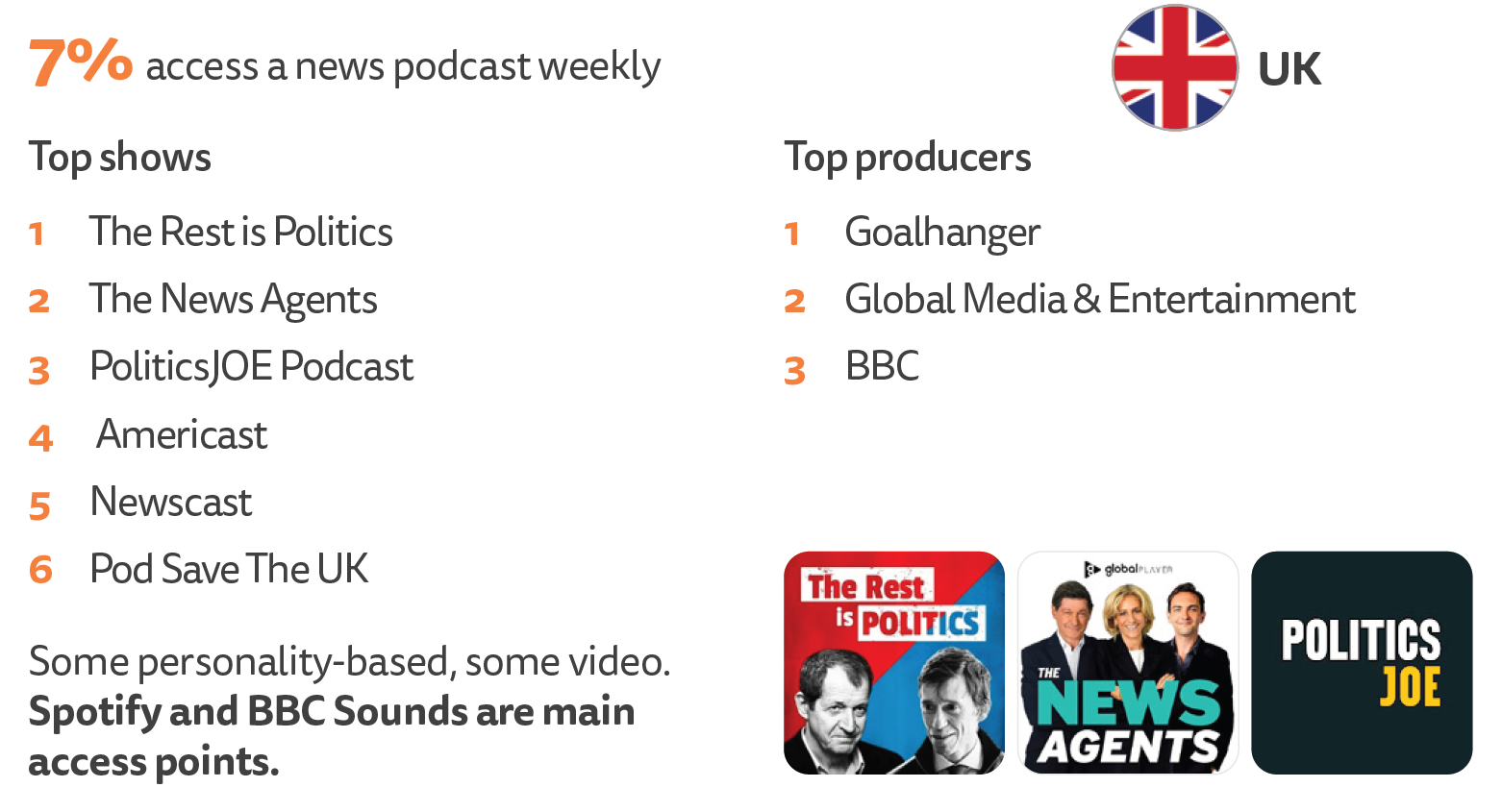Podcast consumption in the UK is also below the global average in the Reuters Institute survey, with 7 per cent of respondents listening to a podcast weekly. The BBC is a major podcasting force — with Newscast and Americast both featuring prominently — alongside engaging but serious-minded formats from commercial providers such as The Rest is Politics (Goalhanger) and The News Agents (Global Media).
