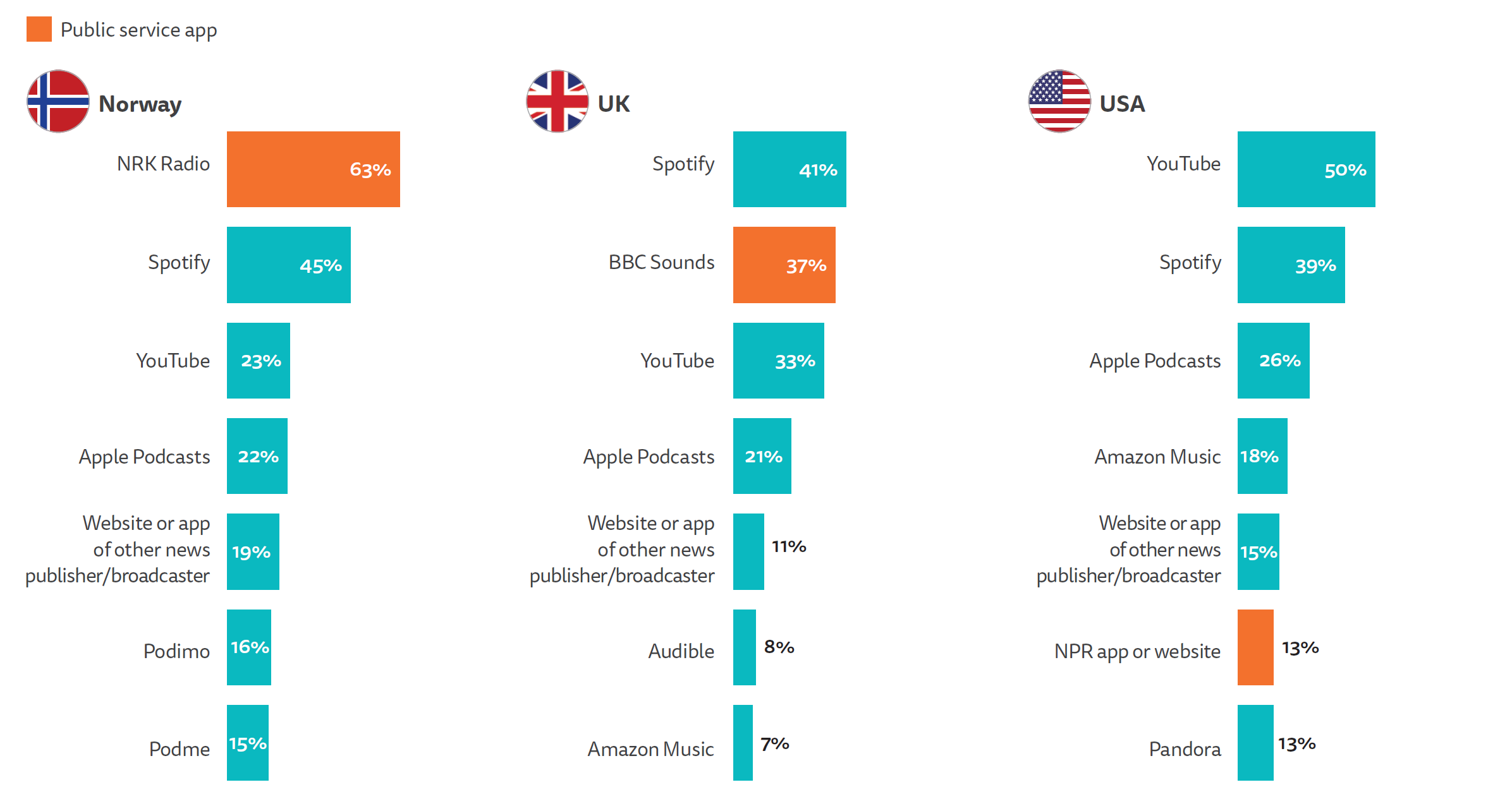 The Norwegian podcasting market shares several structural and cultural characteristics with Britain’s, perhaps even more skewed toward legacy media dominance. In Norway, the public broadcaster NRK commands a strikingly high share of listenership — with its app NRK Radio used by nearly two-thirds (63 per cent) of podcast listeners.