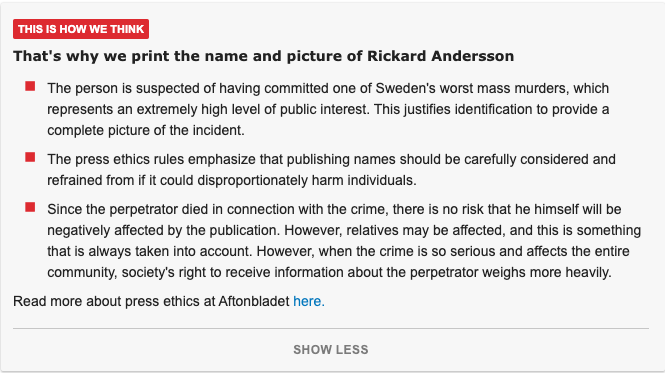 "Questions about why we choose to name a suspect in one case but not in another are among the most common we receive, and there are many conspiracy theories surrounding these decisions," explains Martin Schori, deputy publisher and director of editorial AI and innovation, Aftonbladet, one of Schibsted's main Swedish titles.