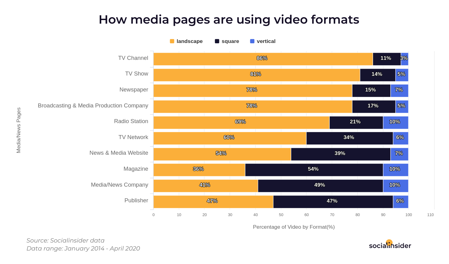 With the exception of pages under the categories Magazine, Media/News Company and Publisher, most media outlets use the landscape format when filming their videos.