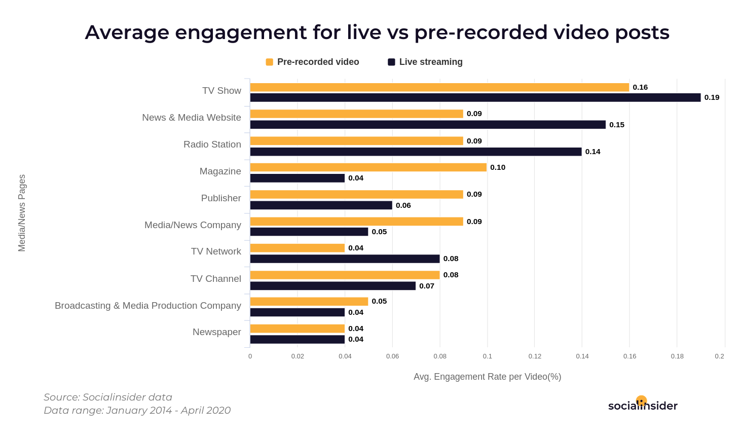 In the case of TV Show pages, the average engagement rate for live streaming rises from 0.16 per cent to 0.19 per cent, while news and media websites rise from 0.09 per cent to 0.15 per cent.
