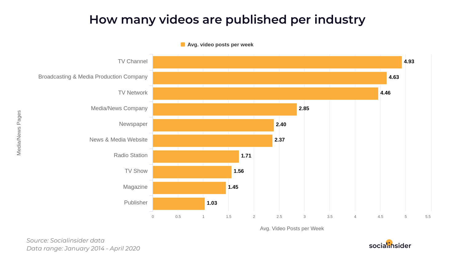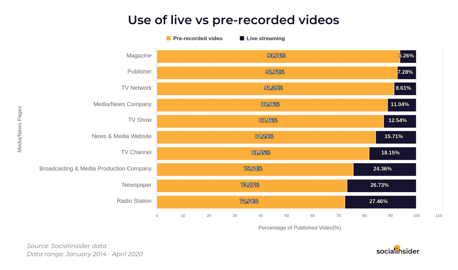 According to a Socialinsider study, news and media pages post more videos on Facebook than any other industry, with two to three per week. These videos typically last seven to eight minutes, and 15 per cent of them are lives.