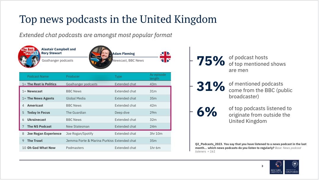 The 2023 Reuters Institute Digital News Report (DNR) revealed that podcasts were once again on the rise, but news podcasts face stiff competition for attention: 30 per cent of Brits listen to a podcast, but just 8 per cent listen to a news podcast.