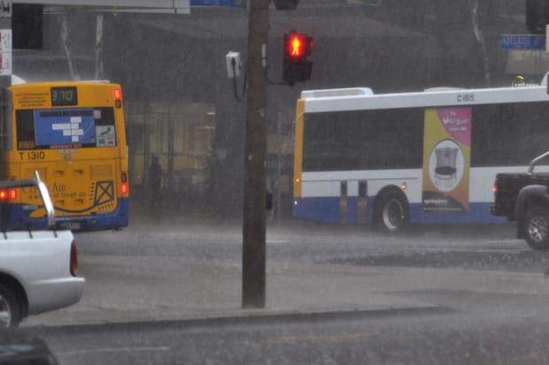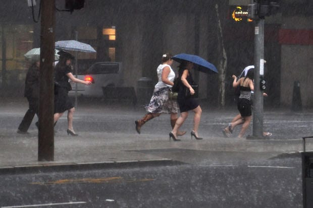 Pouring rain looks good but is made more interesting with the addition of people 'running for their lives'.