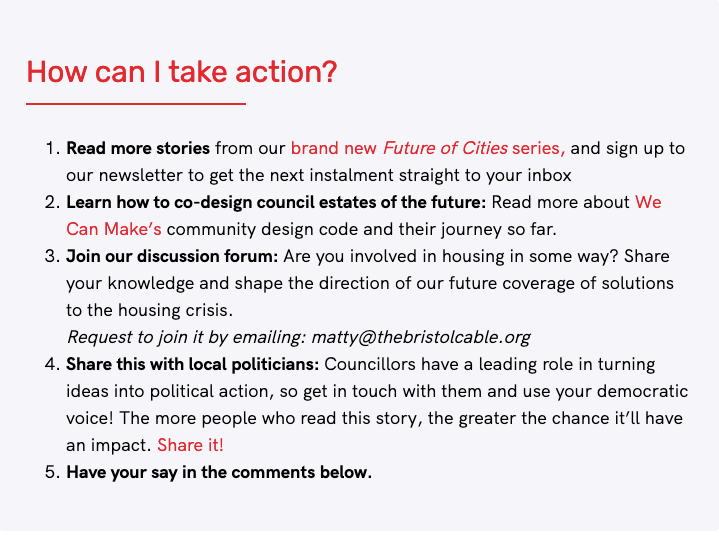 UK co-operative news organisation The Bristol Cable has started a solutions journalism project reporting on the problems that cities face in housing, transport and resourcing.