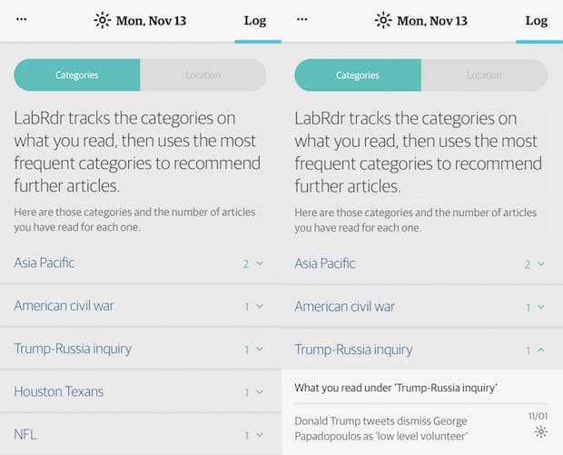 Users can see what they have been clicking on as well, by visiting the 'log' section of the app, which displays all the categories they read and that LabRdr is tracking, for example 'Trump-Russia inquiry', 'Silicon Valley' or 'Democrats', the number of articles accessed in each category, and the headlines of each of these stories.