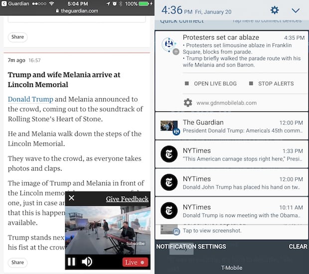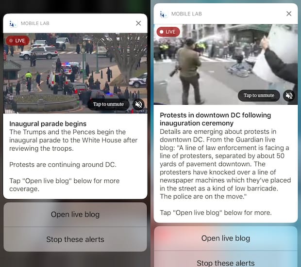 Two other new features from the Lab were used to cover the inauguration. Users could follow a rolling live blog in a push notification, available on Android users through the Chrome mobile browser, and aimed at providing updates on their lock screens if they "didn't necessarily want to watch or follow along in detail". Those who were following the live blog on the Guardian website on their phones or even desktop were also able to simultaneously read the posts and watch a live stream of the ceremony.