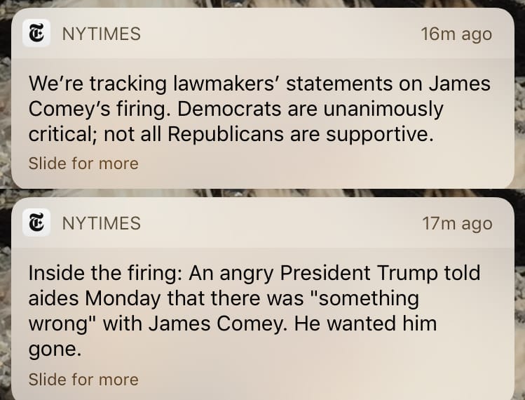 The New York Times also sent out a double push alert on Tuesday (16 May) to its scoop that President Trump had requested Comey to stop the investigation into former national security adviser Michael Flynn. You can read more about the decision to push two consecutive alerts in this Nieman Lab piece.