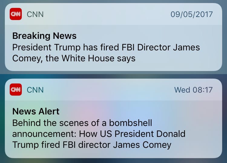 CNN sent a total of 11 alerts between 9 and 16 May. The first one, "President Trump has fired FBI Director James Comey, the White House says", was a "standard, OMG alert", said Matt Wells, senior editor, programming, CNN International Digital.