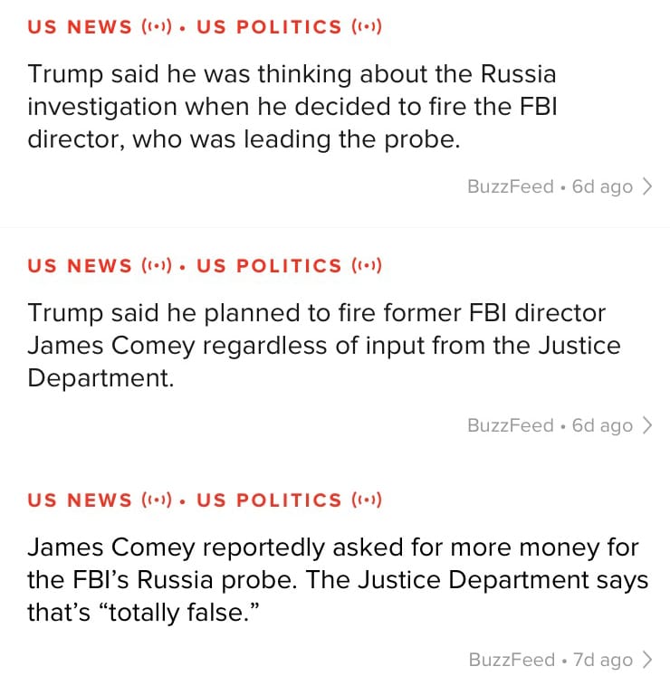 The BuzzFeed News app also allows users to choose which categories they receive alerts from, including to opt out of breaking stories, so updates about Comey's firing wouldn't reach those subscribing to the business, science or entertainment sections.