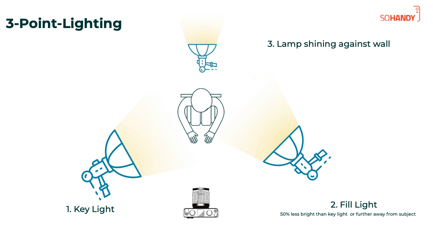 The (below) three-point lighting technique is widely used to enhance interviews, which gives evenly distributed light and pulls the subject into focus.
