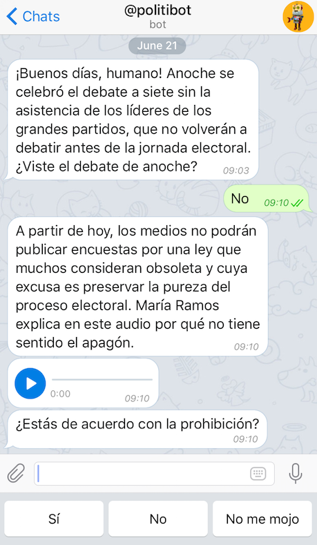 This is how Politibot, a two-week-old Telegram bot, greets users who add it on the messaging app to keep up to date with Spain's upcoming general election on 26 June.