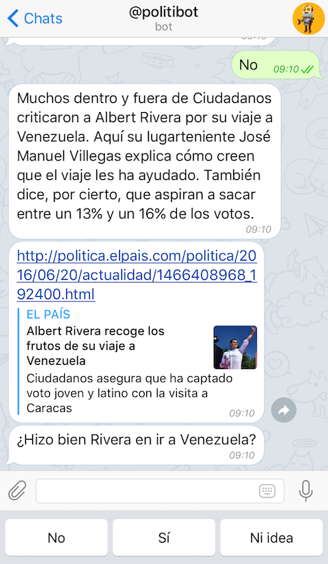 The last two push alerts the bot has sent before publication have also contained short soundbites from Spanish politicians, followed by Politibot asking users whether or not they agreed with the statements made.