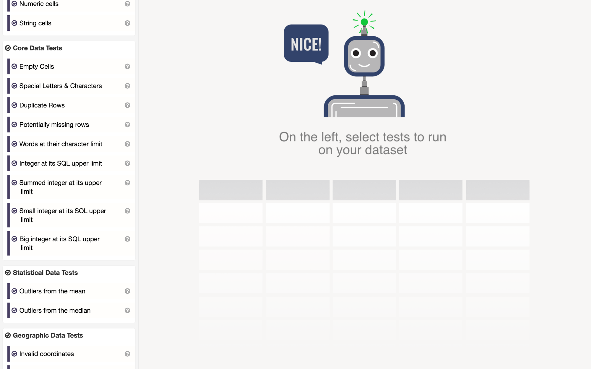 After loading your data, you can choose from the list below the upload field which tests you would like to run on your dataset. There are various options, separated into four categories: information and diagnostics; core data tests; statistical data tests; and geographic data tests, such as invalid latitude and longitude coordinates.