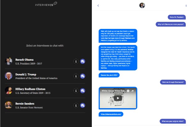 How is it of use to journalists? Simple Q&As can sometimes feel dull. With InterviewJS, journalists can build a story as interactive messaging, complete with the three dots as the interviewee “types” their answer. This puts the reader in the journalist’s seat -- instead of simply reading, they ask the interviewee pre-selected questions and watch the conversation unfold. And who wouldn’t want to chat directly to Barrack Obama or Donald J. Trump about Obamacare?