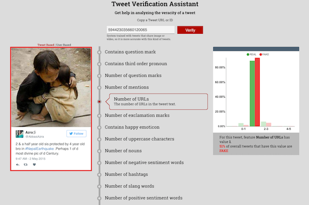 A tweet used as an example by Reveal, containing an image of two children hugging and a description connecting them to the Nepal earthquake was determined as being fake by the verification assistant. The tweet did not include any URLs, so the tool highlighted that 51 per cent of overall tweets with a similar value are usually fake. However, the tool also found that 59 per cent of tweets that include one hashtag, similarly to the tweet analysed, are real.