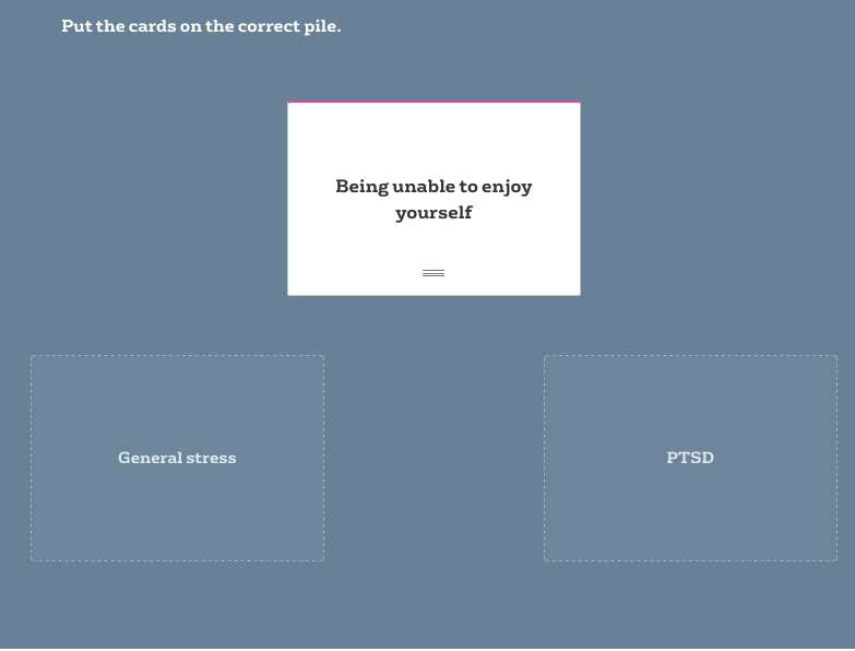 You are tested on the symptoms of PTSD, and there is a self-test section too (not intended to replace a proper doctor consultation or to be taken by under 18s). Scores over 16 indicate you are struggling to cope with stress, scores over 32 are more consistent with serious serious stress issues. In the 'roads to recovery' section, you can find treatment and self-care options.