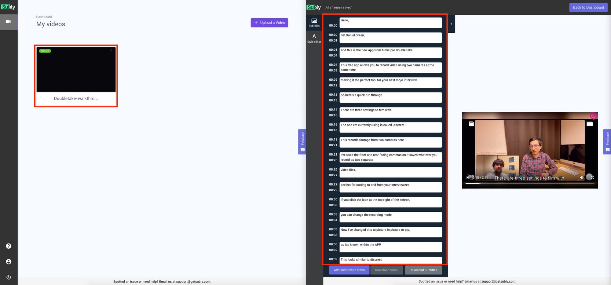 Once that is finished, you are then able to download your subtitled video for posting on social media, as well as the SRT file for your subtitles, useful when posting video content onto platforms like YouTube and Facebook.