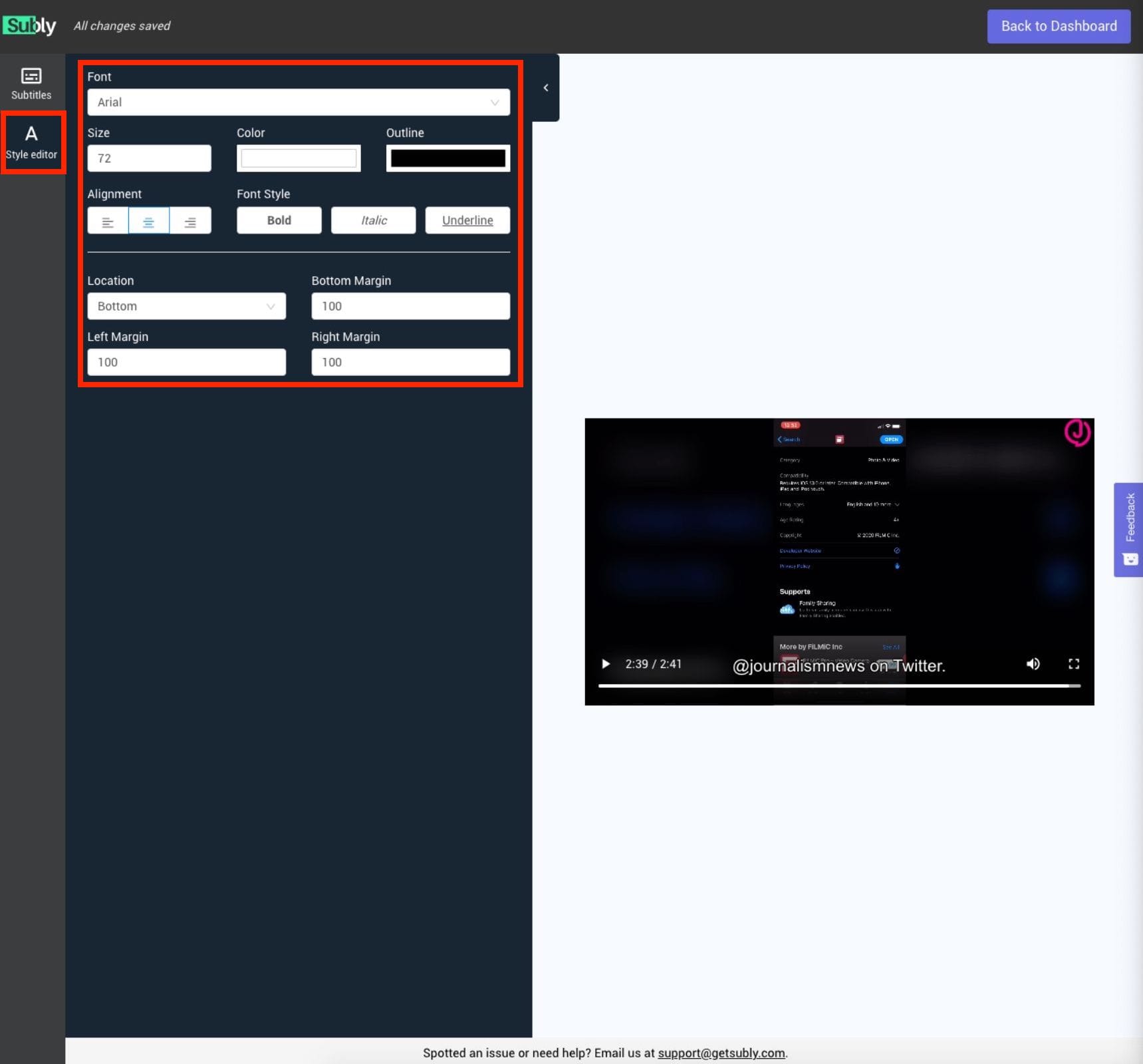 After you have done this, you are also able to change the font, size and colour of your subtitles by clicking the 'Style editor' icon. This also allows you to move the subtitles to a different part of the screen.