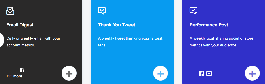 You can also set-up automated ‘thank you tweets’ and ‘performance post’, which will either give an automatic shout-out to your biggest social fans or showing off your top metric to your followers.