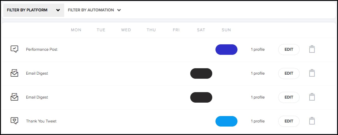 Lower down on the dashboard there is a calendar, where two drop-down menus give you the option to look at your scheduled posts ‘by platform’ or ‘by automation’.