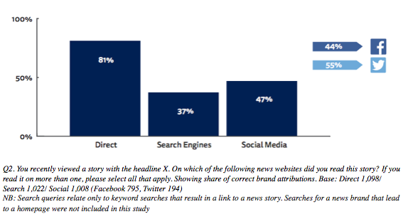 Less than half could remember the name of the news brand for a particular story when coming from search (37 per cent) or social media (47 per cent). This compares with a correct attribution rate of 81 per cent for users who arrived directly from another page on a specific news website.