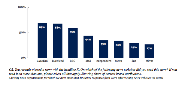 Content produced by some news brands is remembered far more than that from others. When coming from social media, stories from the Guardian (69 per cent), BuzzFeed (68 per cent), and the BBC (59 per cent) were correctly attributed around twice as often as stories from The Independent (35 per cent), the Mirror (27 per cent), or The Sun (29 per cent).