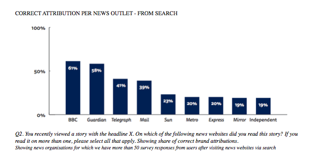When coming from search, stories from the BBC (61 per cent), the Guardian (58 per cent), and the Telegraph (41 per cent) were correctly attributed far more often than stories from Daily Express (20 per cent), Daily Mirror (19 per cent), or The Independent (19 per cent).
