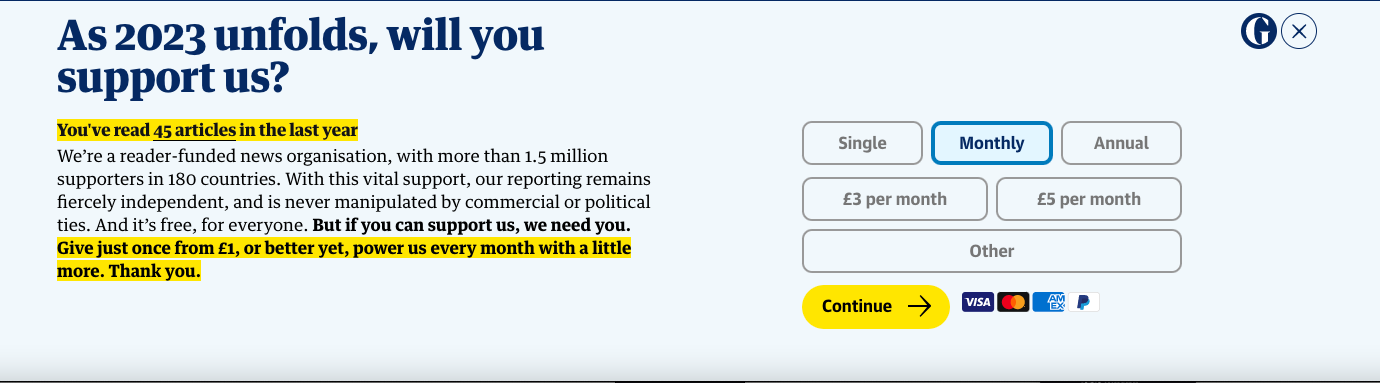 Readers are reminded of what they have already consumed and are compelled to support independent journalism. In other words: 'you have enjoyed all this content for free, but if you want us to survive, we need you to pay'.