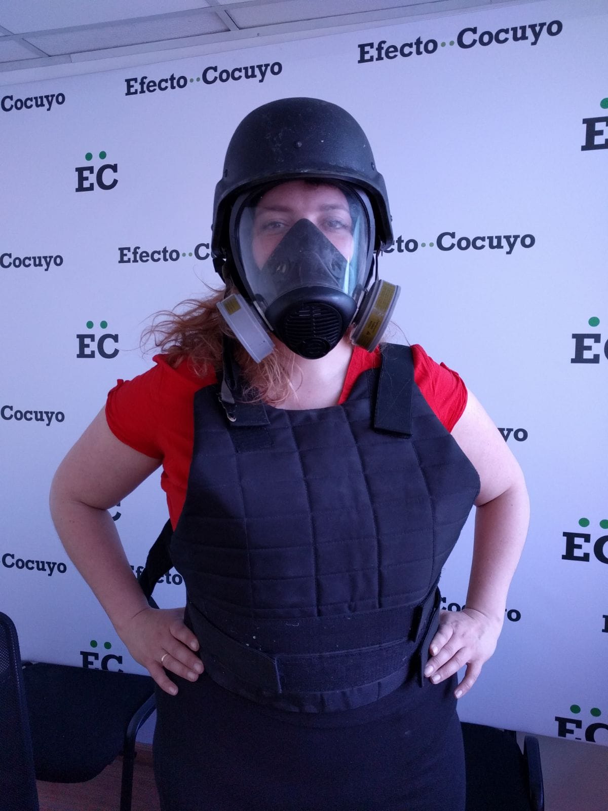 Nienke Huitenga tries on the protective gear, worn by Efecto Cocuyo journalists