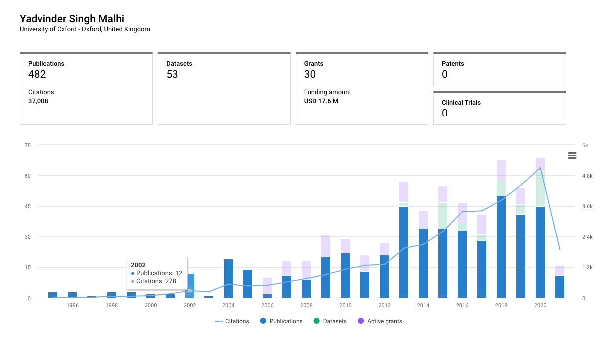 Clicking on an individual name will bring up an overview of their career, showing their most active years and all manner of details from grants, patents and other works.