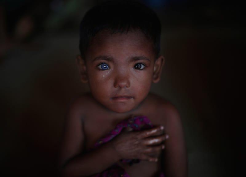 Hosne Ara, 4, a Rohingya refugee who fled Myanmar two months ago listens to children singing at a children's centre in Kutupalong refugee camp near Cox's Bazar, Bangladesh. REUTERS/Hannah McKay