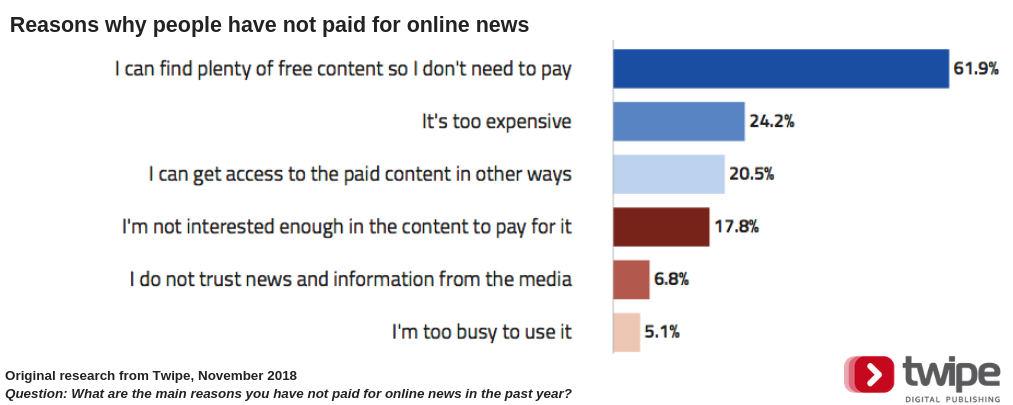 It comes as no surprise that the number one reason readers say they do not pay for digital news is because they can already find plenty of free content online.