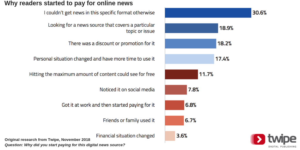 30.6 per cent of readers who started paying for digital news said they did so as they couldn't get the specific format for free elsewhere.