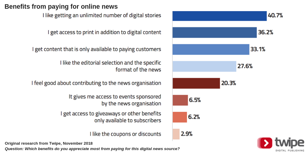 While the paywall was not the most common trigger to start paying for digital news, the ability to read an unlimited number of digital stories was the most appreciated benefit of a digital subscription.